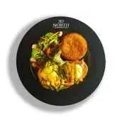 Two poached eggs, smoked salmon, dill, capers, mashed avocado, hollandaise sauce, brown loaf, mixed greens and potato cake