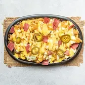 French fries, crispy chicken, roast beef, jalapeno, cheddar cheese sauce, mayonnaise and akleh Sauce