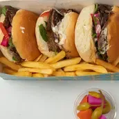 3 Meat shawerma bun sandwiches, served with french fries and pickles