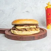 Beef slices, caramelized onions and mozzarella with akleh sauce, cut in half served with fries and a box of pickled cucumbers.