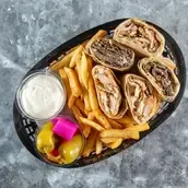Served with french fries, garlic dip or chickpeas and pickles or coleslaw salad.