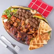 Kofta, shish tawook, kebab, quail, arayes, fried kebbah and French fries, enough for 3 persons