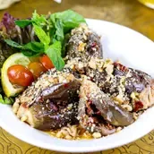 Dish made with pickled baby eggplants stuffed with walnuts and red pepper paste.