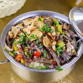 Delight in the flavorful bliss of our Meat Shawerma Fatteh, a mouthwatering combination of tender marinated meat, aromatic spices, crispy bread, and creamy yogurt sauce, creating a tantalizing Middle Eastern feast.