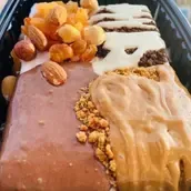 Qashtota rice pudding divided into 4 parts a quarter of lotus, a quarter of oreo, a quarter of nutella, and a quarter of nuts