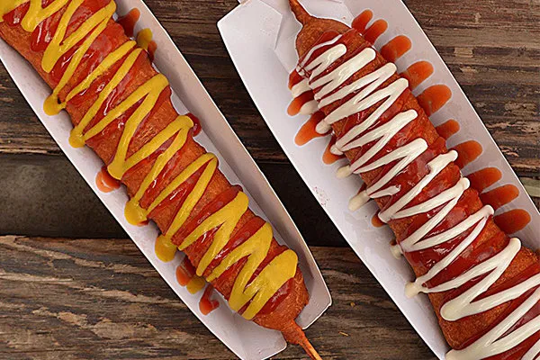 Tender hot dog on a stick, dipped in batter and fried