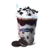 Milk shaken with ice, topped with cookies and cream, whipped cream and chocolate sauce.