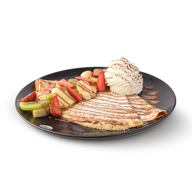 crepe, decorated with fresh seasonal fruits, and served with your choice of chocolate