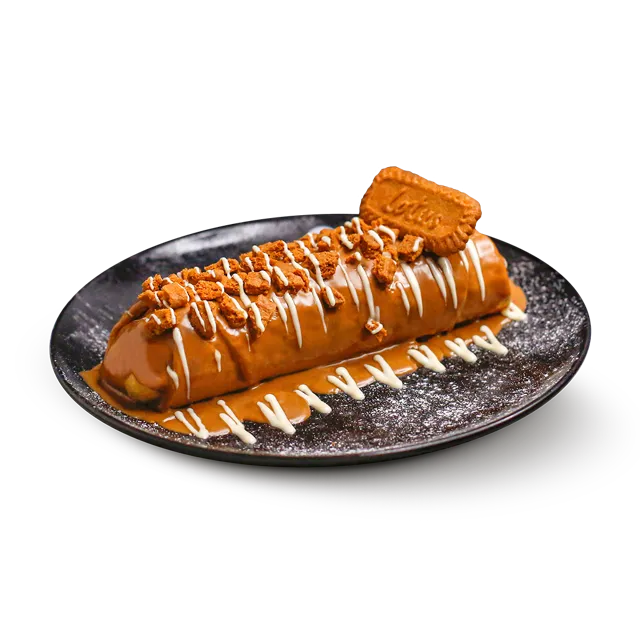 crepe filled with strawberries, brownies, chocolate caramel cream, and speculoos ganache, crumbs and spread. Topped with speculoos, white chocolate, and our homemade speculoos biscuit crunch
