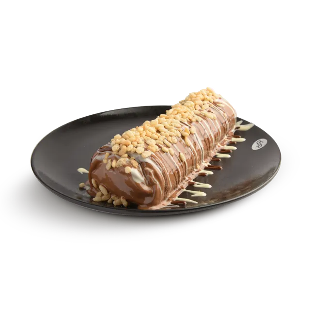 crepe, filled with brownies, cream puffs, cream cheese and fresh strawberries, topped with our three signature chocolate flavors and sprinkled with crispy rice cereal