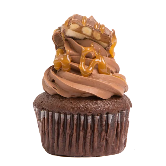 Fluffy chocolate cake decorated with delicious chocolate cream and Snickers chocolate pieces