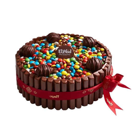 Al-Abd's fluffy chocolate cake is filled with fresh cream, covered with a layer of chocolate, decorated with M&Ms and chocolate balls on top and surrounded by chocolate wafers.