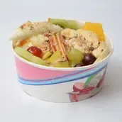 Rice pudding topped with a scoop of vanilla ice cream and fresh fruit pieces.