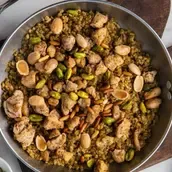 Freekeh, small chicken pieces, nuts and served with yogurt