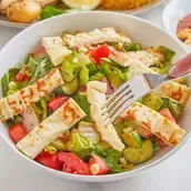Halloumi cheese, lettuce, tomato, cucumber, green onion, pepper, Rocca, thyme, mint, radish, sumac, olive oil and pomegranate molasses.
