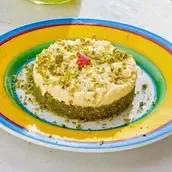 A dough of grated halabi pistachio, ground kunafa and Lebanese qeshta served with Lebanese syrup