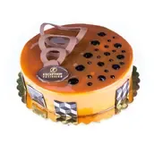 Filling: vanilla cake with white cream, finishing: caramel glacier with show chocolate.