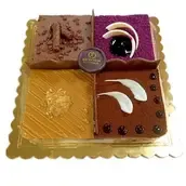 A quarter of purple filet, a quarter of chocolate fudge, a quarter of chocolate and a quarter of lotus.