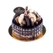 Filling: cake with chocolate and chocolate cream, finishing: Oreo biscuits with Snickers chocolate and macron.
