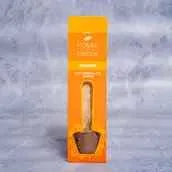 A chocolate spoon that is stirred in Hot Milk to Make delicious hot chocolate at home. Orange Chocolate Flavor