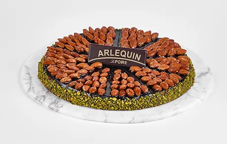 PISTACHIO DOUGH COVERED WITH CHOCOLATE AND CRUSHED PISTACHIO, TOPPED WITH CARAMELIZED ALMONDS