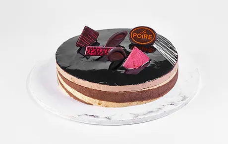 CHOCOLATE SPONGE CAKE FILLED WITH CRUSHED ALMONDS AND A LAYER OF RASPBERRY, COVERED WITH CHOCOLATE MOUSSE