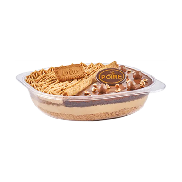Lotus half: A layer of othmanelya kunafa topped with lotus mousse cream and lotus crunchies. Nutella half: A layer of othmanelya kunafa with caramel cream and chocolate fudge topped with Nutella chocolate and caramelized hazelnut
