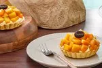 Vanilla tartlet filled with white chocolate and mango cream, topped with fresh mango bites