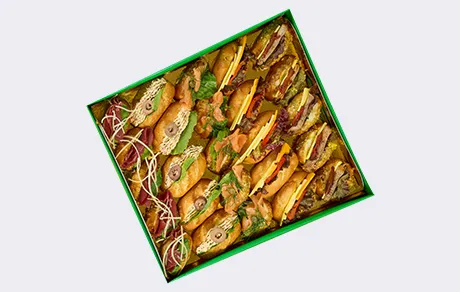 A PREMIUM SANDWICH BOX WITH DIFFERENT FILLINGS; ROAST BEEF, MINI PAIN PRETZEL BRIZOLA, CHEESE LOVER, CREAM CHEESE WITH MINT