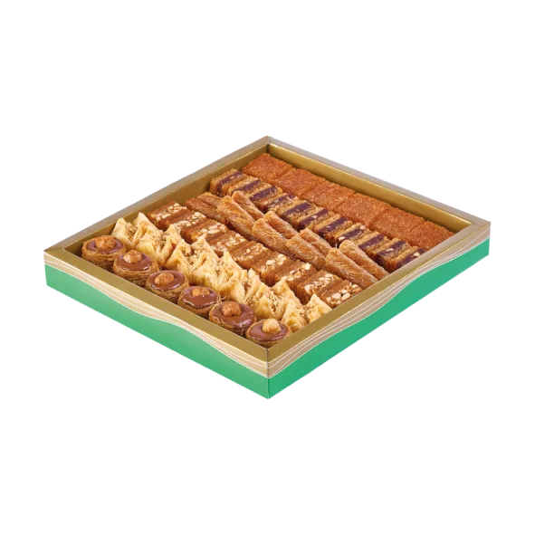 Original Mixed Oriental Sweets Box; Konafa with nuts, Nutella and hazelnut asawer, konafa fingers, baklava, dates konafa and basbousa