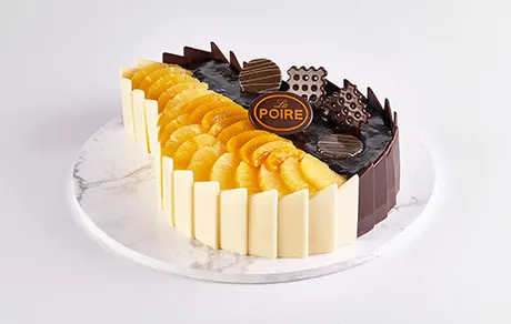 1/2 CHOCOLATE; 3 LAYERS OF CHOCOLATE SPONGE CAKE FILLED WITH CHOCOLATE CREAM. 1/2 VANILLA; 3 LAYERS OF WHITE SPONGE CAKE FILLED WITH LA POIRE'S SPECIAL CREAM AND TOPPED WITH PINEAPPLE AND PEACH.