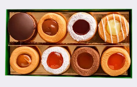 A MIXED BOX WITH; JAM SABLE, LEMON SABLE, CARAMEL SABLE, CHERRY SABLE, CHOCOLATE SABLE