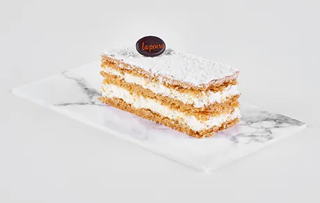 LAYERS OF LA POIRE’S FAMOUS MILLEFEUILLE, FILLED WITH THE DELICIOUS MILLEFEUILLE CREAM & COVERED WITH POWDERED SUGAR.