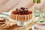 Vanilla sponge cake filled with tiramisu cream, instant coffee and cocoa, topped with cocoa powder and ladyfinger biscuits