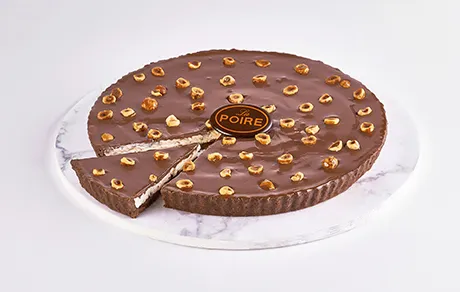 LAYERS OF CHOCOLATE SABLE BISCUIT WITH A LAYER OF FRESH CREAM, NUTELLA AND HAZELNUTS