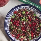 Quinoa, lentils, parsley, dried raisins, and peas