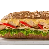 Grilled chicken, lettuce, tomato, cheddar cheese and secret sauce served in brown baguette bread.