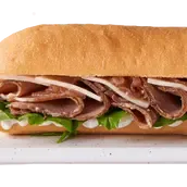 Roast beef, rocca, caramelized onion, provolone cheese, and rosemary mayonnaise, served in panini bread.