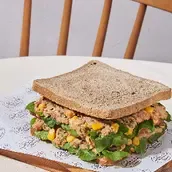 Toast bread, tuna mixture with onions, sweet corn, sriracha mayonnaise sauce, bell pepper and rocca.
