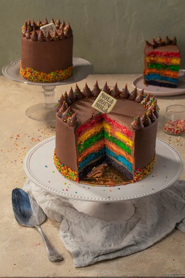 Vanilla Cake 7 layers colors filling Belgian Milk Chocolate, Wheat Juice, and it has a colourful sprinkle sugar. Serve: from 8 - 10 person