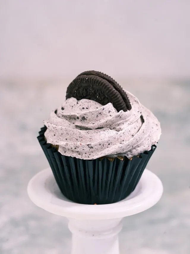Vanilla cake with Oreo crushed and has an Oreo piece underneath - Ice Cream Cheese with Oreo crushed and topped with Oreo.