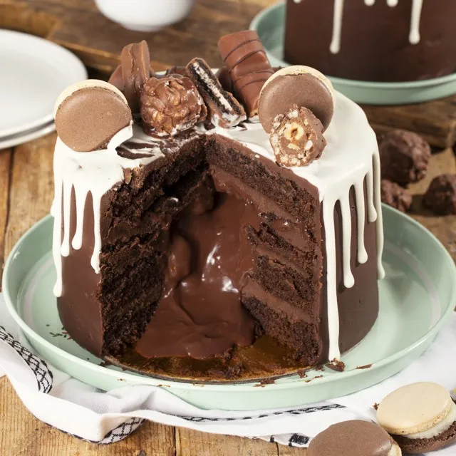 Chocolate Fudge Cake - Chocolate Ganache - White Chocolate Sauce on top - Chocolate Macaron - Oreo Chocolate - White and Chocolate Maltesers - Hazelnut Chocolate From 10 to 12 Persons