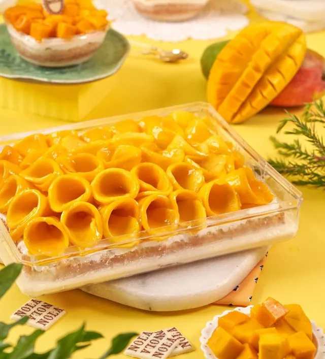 Vanilla cake with a mixture of milk consisting of (evaporated milk, condensed milk and fresh cream), topped with fresh cream and mango pieces - enough for 10 persons