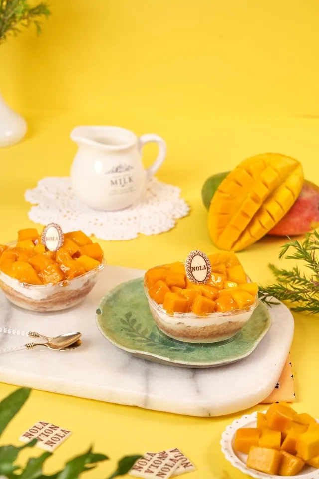 Vanilla cake with a milk mixture consisting of (evaporated milk, condensed milk and fresh cream) topped with fresh cream and mango pieces - enough for one person