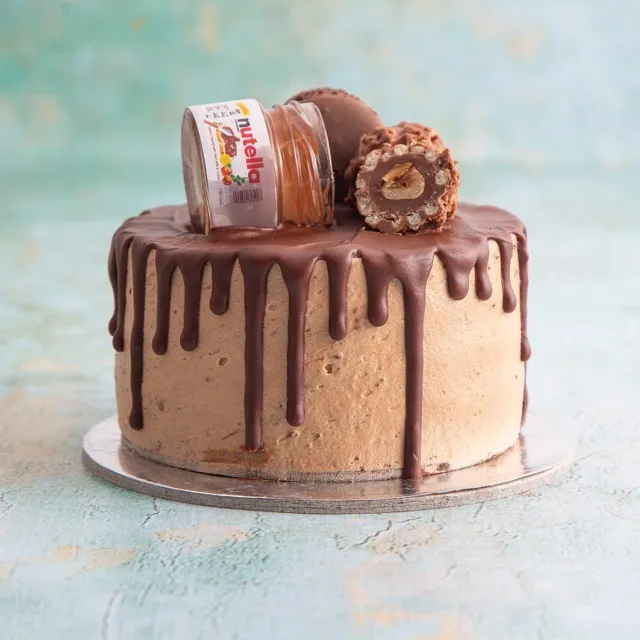Fudge Cake - Nut Cheese - Butter Cream Nutella - with Nutella on top - Chocolate Hazelnut - Chocolate Macaron. Serve: 2 Persons