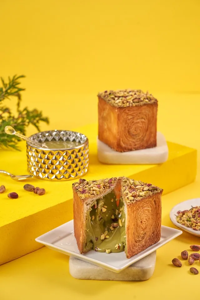 Cube shaped croissant with pistachio spread and topped with grated pistachio - enough for one person