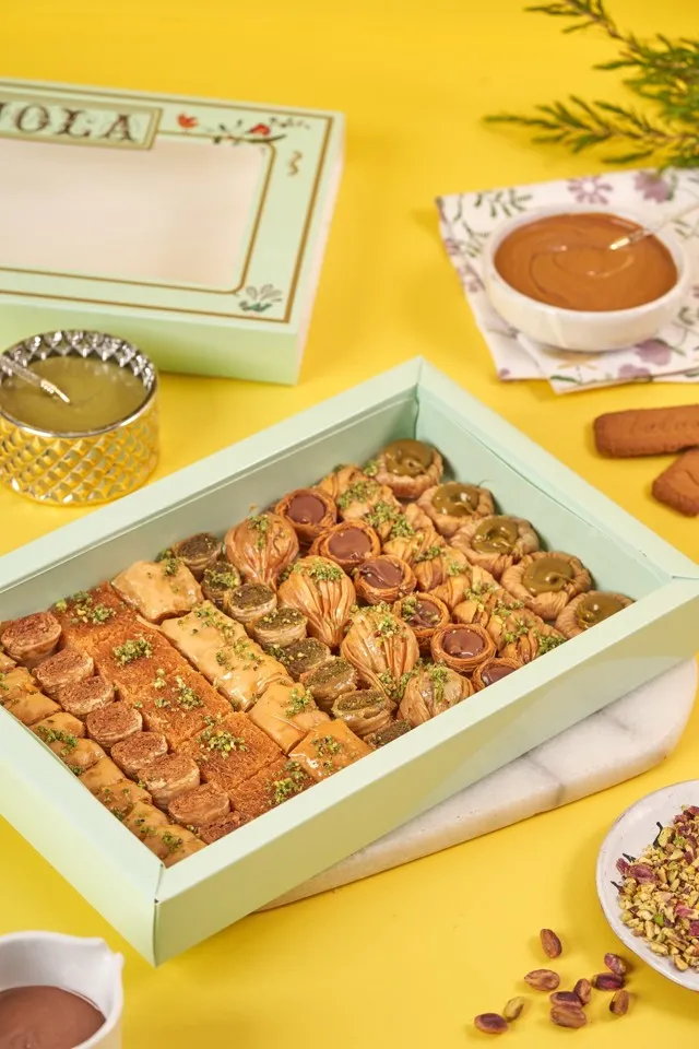 A large mixed oriental dish (Turkish kunafa - cashew baklava - Nutella kunafa bracelets - lotus baklava bracelets - Sultan's eyes with nuts - pistachio baklawa - Turkish cashew baklava)- enough for 6 to 8 persons