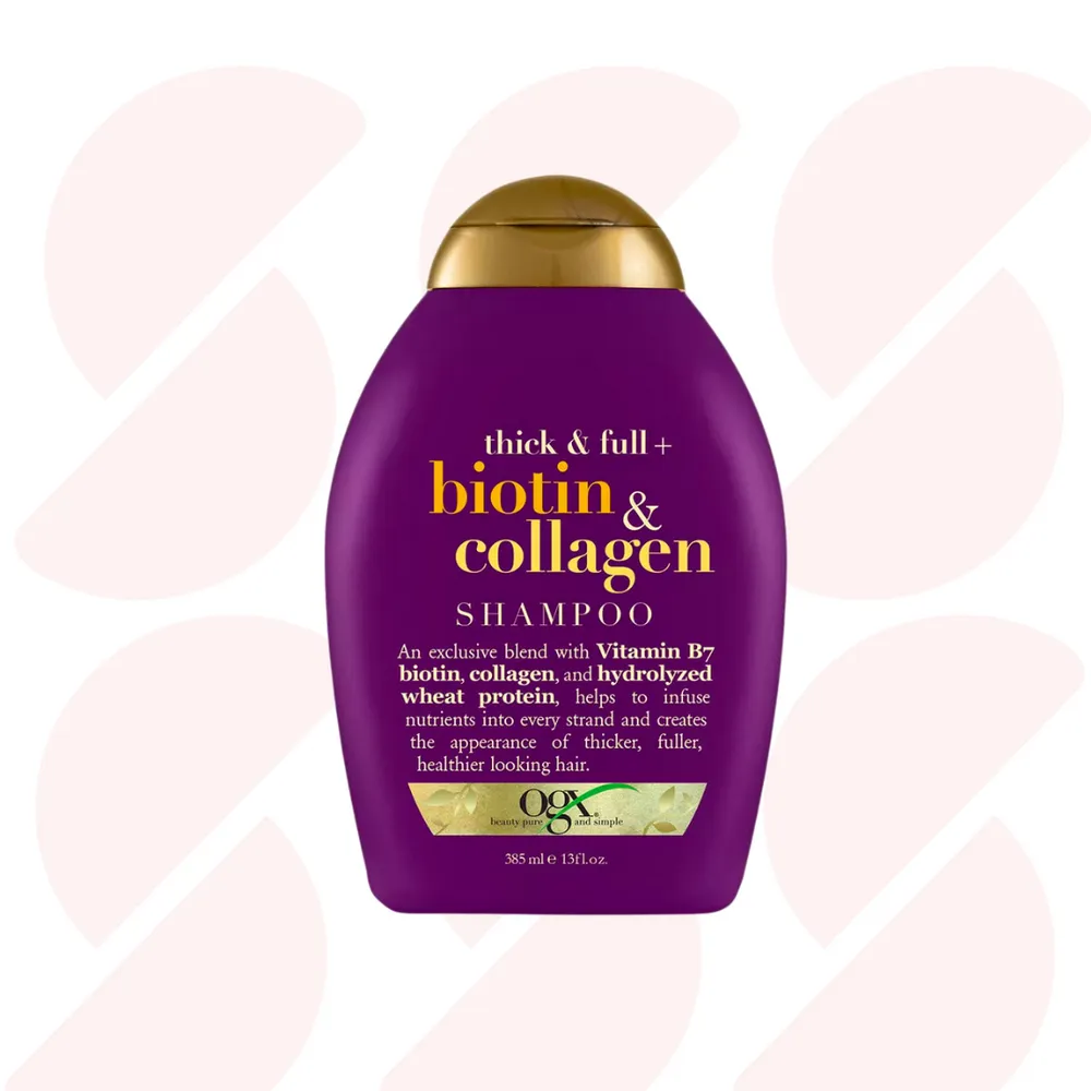 Plump up the volume in thin hair with the OGX Thick & Full + Biotin & Collagen Hair Volumizing Shampoo. Ideal for flat to medium volume hair, this thickening shampoo leaves hair feeling fuller and helps create more abundant-looking locks. The nutrient-rich, plump-it-up formula contains vitamin B7 biotin, which helps strengthen hair to maintain growth, and collagen, a building block for healthy hair. The luscious blend in this thickening shampoo also contains hydrolyzed wheat proteins for hair that feels thicker and healthy-looking. Plus, the bergamot, jasmine and vanilla scent makes lathering up an all-around sensory experience that leaves locks with an irresistibly good smell. Paraben-free with sulfate-free surfactants, this thick hair shampoo helps turn up the volume on your tresses. For best results, use this shampoo with the entire OGX Biotin & Collagen hair care collection to help infuse nutrients into every strand.