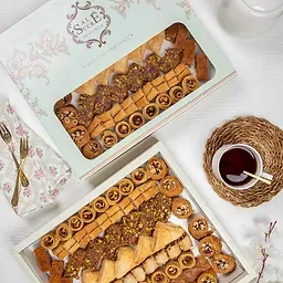 Kunafa with nuts, pistachio basbousa, plain basbousa, Burma pistachio nuts, hazelnut bracelets, rosettes, almond fingers, Burma hazelnuts.Net weight: 1,840 kg