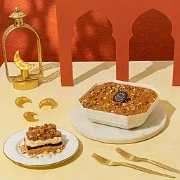 Crispy konafa and fudge cake filled with chocolate hazelnut spread & lotus spread, topped with crunchy lotus biscuits & hazelnuts